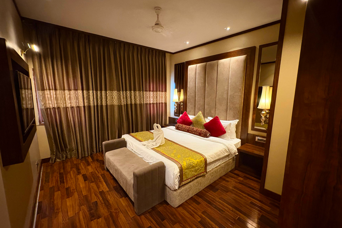 Our premium rooms are designed to provide guests with a luxurious yet cozy experience. The room features a plush king-size bed with soft linens and premium bedding to ensure a peaceful night’s rest. Beautifully layered curtains, golden accents, and wooden flooring add to the sophisticated décor that radiates warmth and charm.